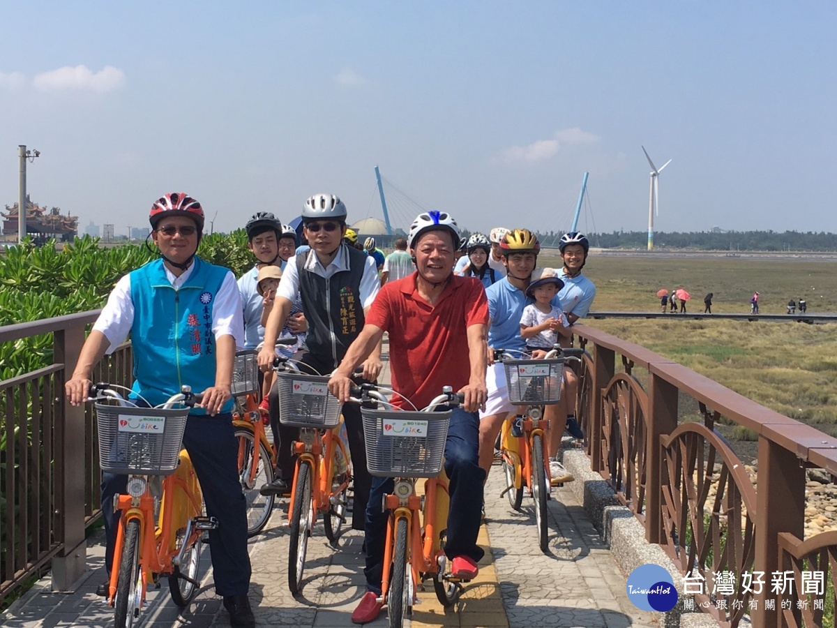 高美濕地再添新亮點!由台中市副議長張清照爭取的「高美海堤自行車道」6日完工啟用,張清照與其胞兄前議長張清堂、市府觀光旅遊局副局長陳育正及青年志工「清年軍」,上午十時一行二十多人騎自行車體驗生態旅遊。
