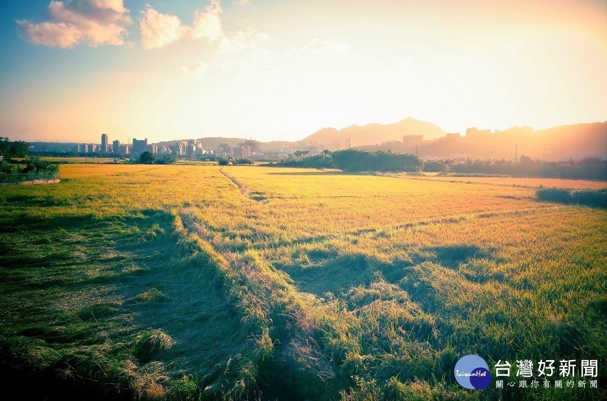 北投的關渡平原是目前台北市唯一面積廣大的平原,有著台北最後一塊大片水稻田。稻田襯托落日的美景(圖/台北市政府)