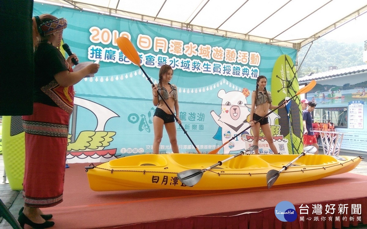 2018日月潭水域遊憩活動推廣記者會暨水域救生員授證典禮,在日月潭伊達邵碼頭萬人泳渡上岸處平台舉行,魚池鄉長陳錦倫致詞指出,到日月潭旅遊觀光型態已經不一樣,在業者推動加值型水上活動工具下,讓遊客到日月潭遊憩有不一樣的感受;南投縣日月潭水上觀光遊憩發展協會解智同理事長表示,早在3、40年前利用手划船遊湖,這幾年有遊艇坐,但喜歡水上活動的遊客卻沒有工具,如今,讓大家有機會乘著水上(電動)腳踏車、獨木舟及立式划槳(SUP)等多樣浮具在日月潭面遊憩。
