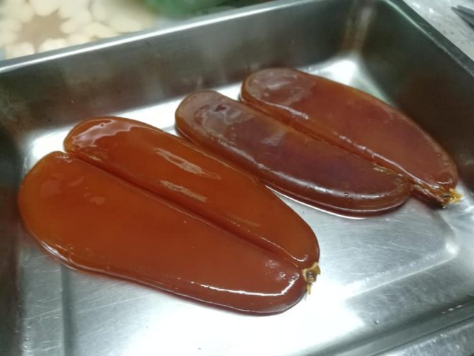 阿爽師日前開發的一口烏魚子就是使用這批,搭配紀念級高粱酒浸烤,吃過的都説讚,根本是人間極品,訂單持續增加。右邊這片色澤略暗沉,打開後瀰漫一股腥味,完全無香氣,即使用高粱酒浸泡一小時再烤,腥味仍在,口感讓人搖頭,只能含淚將地雷烏魚子丟棄。