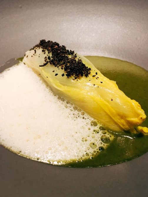 Lionel把苦苣和蜂鬥菜融於一盤,苦上加苦,但是加上伊比利火腿的鹹香泡沫,和cream ,綠豆,巴西利的濃潤醬汁,居然協調出苦中回甘又帶甜的豐富口感。Andrea的水果玉米,削成不可思議的薄片,覆著馬鈴薯麵疙瘩和蒙佩利爾奶油醬汁,神奇的佐以爆米花和烏魚子粉末,濃郁中不失清甜和香脆。二者皆為上品,必須要極豐富的想像力和絕佳的執行力方可成就,缺一不可。