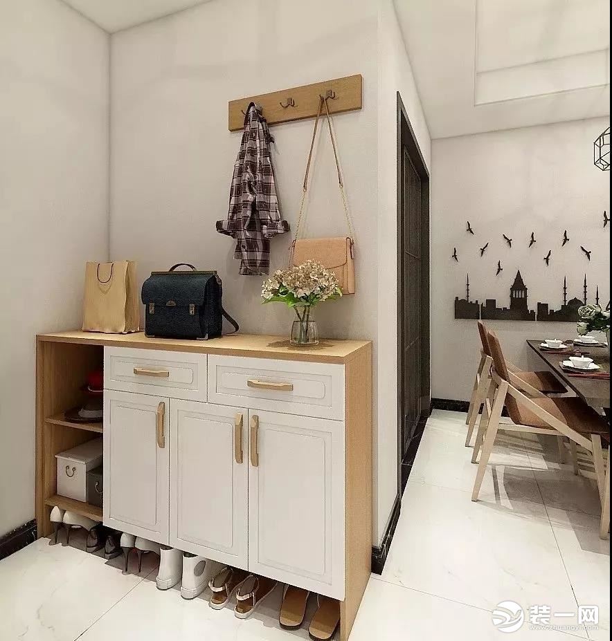 如果是整面牆櫃中間可以做一些鏤空處理,以開放式格局搭配掛鈎,掛包包、帽子、雨傘、大衣都很方便;或者上下櫃中間留一小塊空間,布置一個小平台隨手放東西,如鑰匙,出門就不用到處找了。