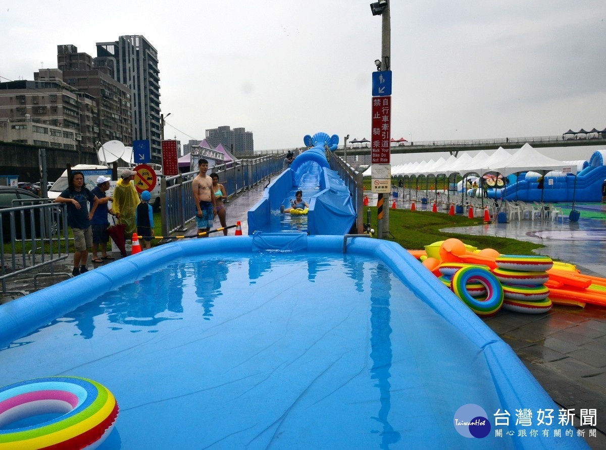 炎熱天氣戲水解暑既清涼又舒暢!新北市高管處推出的新月水道節已正式開園,市長朱立倫30日到場與民眾同樂,他指將自行車牽引道設置成大型滑水道,是新北市連續兩年的創舉,除讓民眾不用去遊樂園就能體驗滑水道樂趣,尤其炎熱天氣家長帶小朋友來戲水區玩樂,安全也能感受到清涼舒暢。