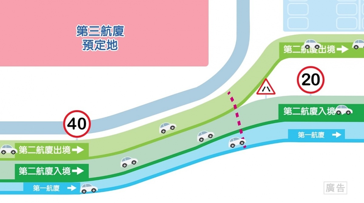 開車往來桃園機場的民眾要注意了,桃園國際機場公司表示,因應桃機第三航廈建設工程施工需要,由國道高速公路開車進出機場的交通動線自今(2019)年4月9日(週二)起將小幅調整,並於4月10日(周三)上午6時前完成新動線切換,部分路段新增彎道,在接近第二航廈路段車道分流並降低速限,桃機公司提醒駕駛人依照指標速限,小心駕駛。