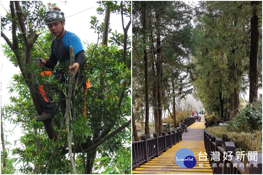 羅東林管處指出,太平山國家森林遊樂區中央階梯兩側栽植有紫葉槭、台灣杉、香杉等景觀喬木,為顧及遊客安全並考量景觀透視度,必須進行修剪、養護等工作。這次不僅有國際認證的樹藝師執行相關工作,更因中央階梯兩側腹地受限,樹上修剪作業無法由高空機具執行,特由專業攀樹師,以人工方式進行,將枯枝及生長勢較差活枝適當修除,以促進樹木健康生長。