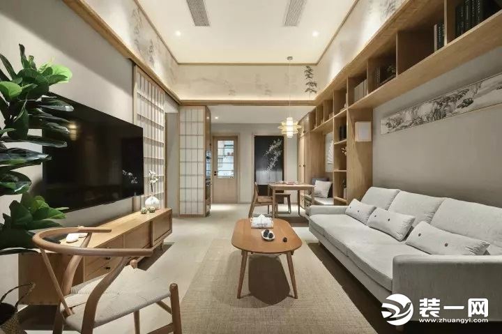 電視背景牆沒有過多裝飾,過道處放置可開合的日式移門,日式裝修風格元素滿滿,典雅靜謐。