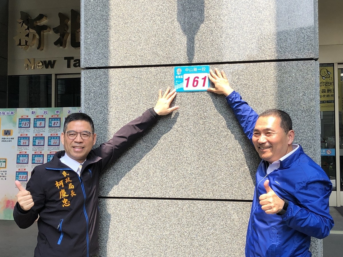 市長侯友宜及民政局長柯慶忠於新北市政府主持首面門牌釘掛。(圖/記者黃村杉攝)