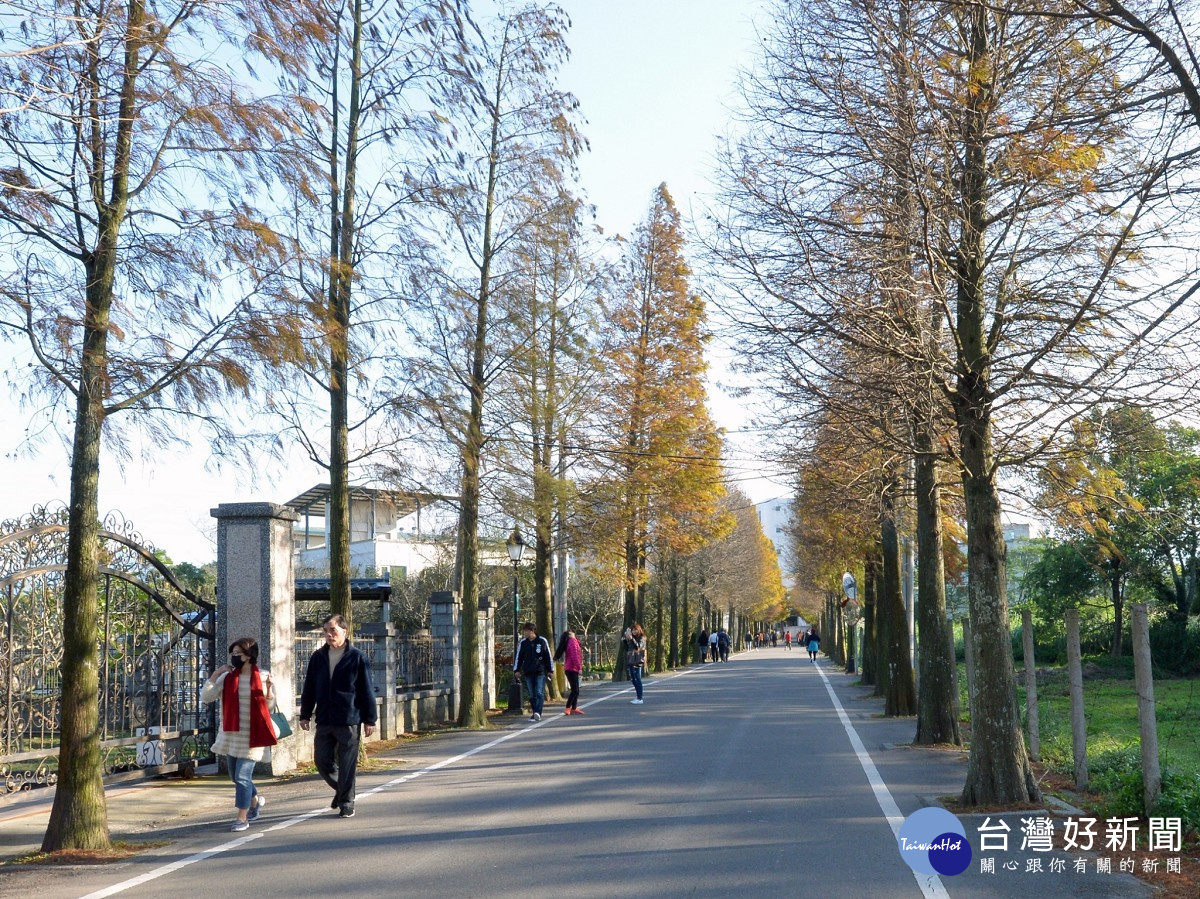 市長鄭文燦等視察漂亮又整齊劃一的落雨松大道。(圖/記者陳寶印攝)