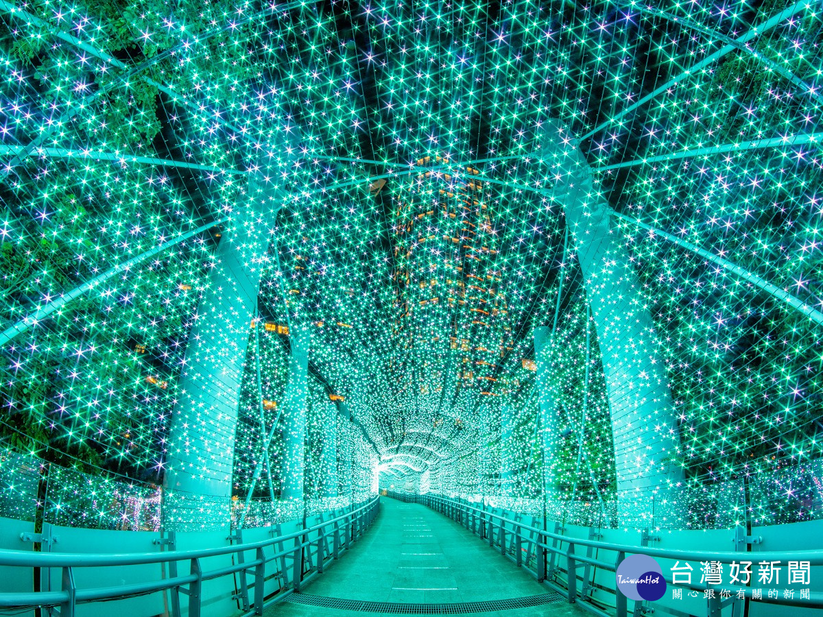 新北市觀光旅遊局今年歡樂耶誕城營造的爆紅景點「藍色時光隧道」。(圖/觀旅局提供)