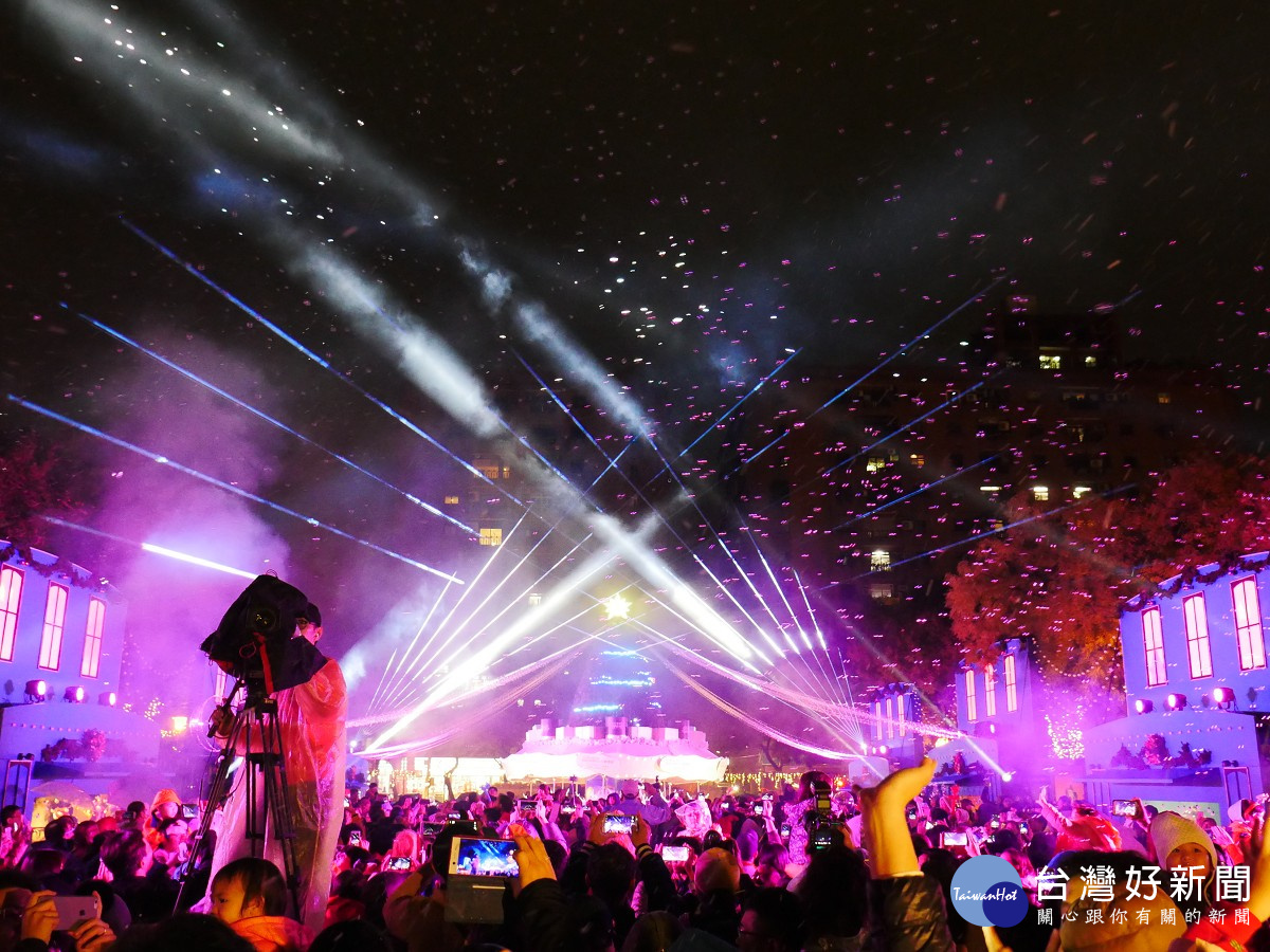 市長朱立倫扮演魔法師施展魔法點亮,現場民眾看到燈光秀驚呼連連。(圖/記者黃村杉攝)