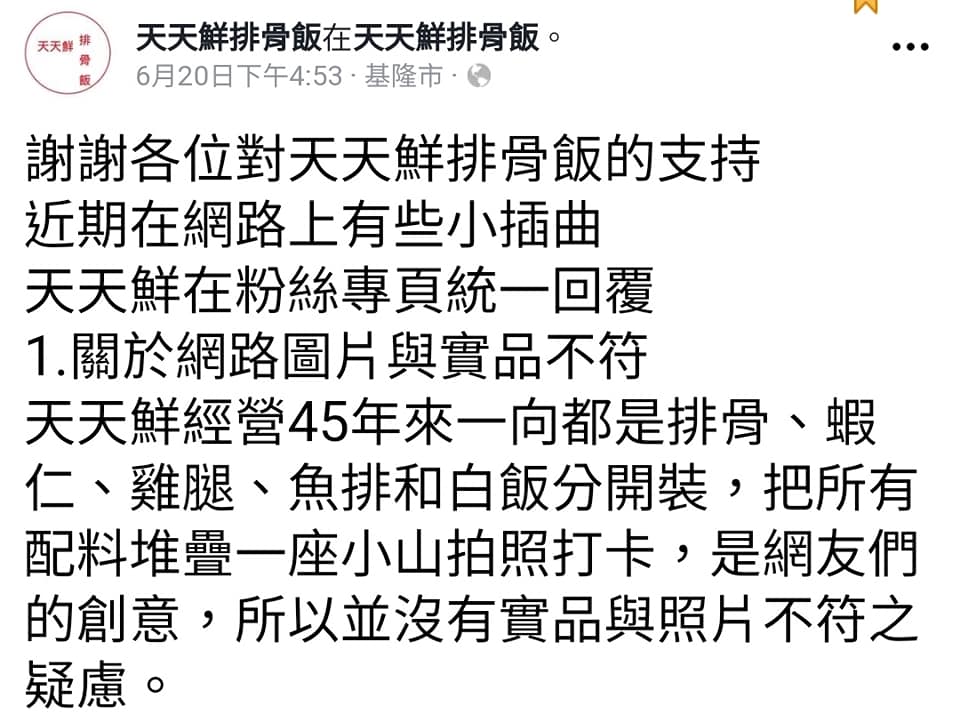 做為基隆的新移民有必要幫大家解惑一下,最近媒體大肆報導的基隆孝三路42巷「天天排骨飯」的照片其實是網友kuso的,實際上每道菜都是分開裝的。 作為天天鮮排骨飯的招牌,雞腿不大,但是有一定的厚度, 肉質細嫩。蝦仁甜脆,最讚的吃法是將炸蛋疊在雞腿上,剖開炸蛋, 讓半熟蛋液混合醬汁,與白飯、高麗菜及酸菜攪拌,濃郁的古早味, 搭配雞肉跟蝦仁,讓人一口接著一口。 配湯點著是味增湯, 豆腐丁跟魚肉給好給滿,湯頭帶著味增香,好喝! #最近每天都大排長龍建議過一陣子再來