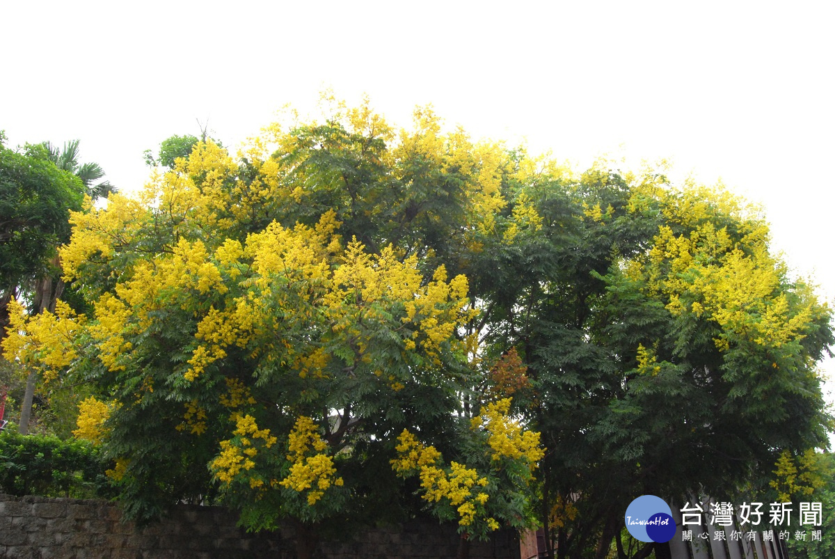 彰化市長邱建富在139線盛開正黃的欒樹下,高唱「欒樹下」,行銷美麗風光。