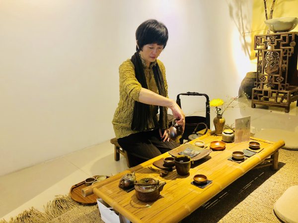 現場邀請了茶道知名的黎月老師,親自用柴燒茶具沏上一壺台灣鹿谷生態茶,滿室飄著烏龍茶的香氣,茶湯在美麗的杯壺映照下,色香氣俱足,茶器的運用,對於喜歡茶道的人相當重要,不同種類的茶葉為維持香氣要用不同大小的茶具沖泡,長期用一壺養心,也養品味,也養滋味,每一個細節動作皆有其速度以及韻味,底蘊溫存。