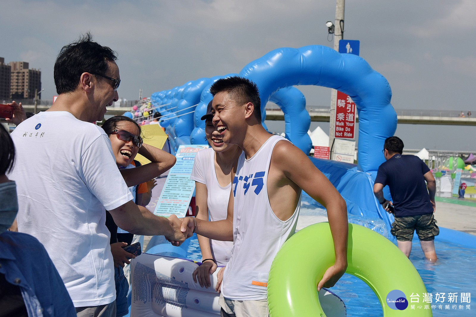 全國首創結合橋樑自行車牽引道設置大型滑水道的新北市「新月水道節」,12日由市長朱立倫主持開幕。(圖/記者黃村杉攝)