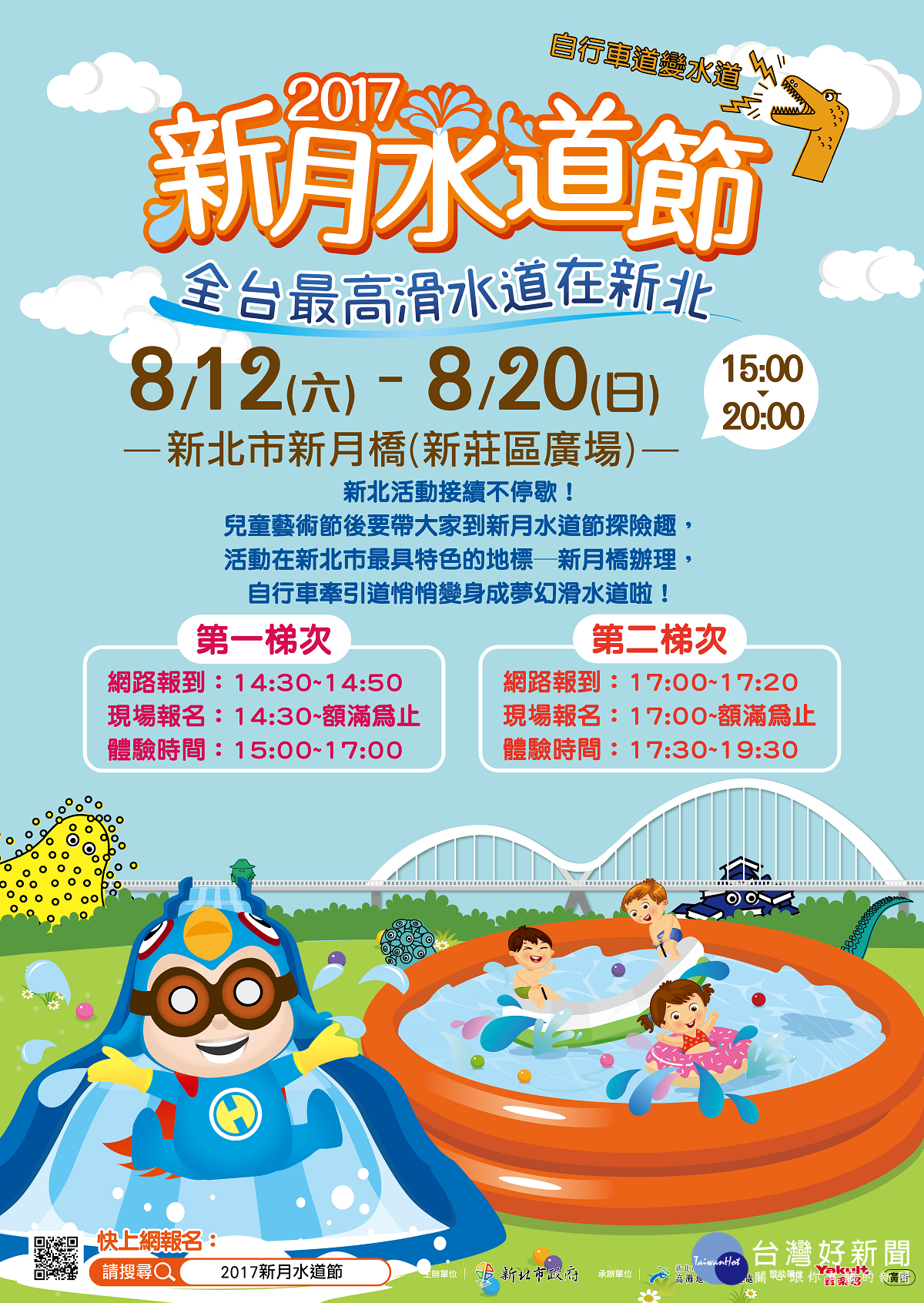 新北市繼兒童藝術節後,首創結合新月橋自行車牽引道設置的大型滑水道,滑道長達135公尺,自新月橋上蔓延至橋下廣場,場面十分壯觀。此外,在新月橋下廣場也設置有水霧迷宮、親子戲水池、鳥人主題滑水道、幼兒球池、水上運動區等多元設施供各年齡層清涼消暑。