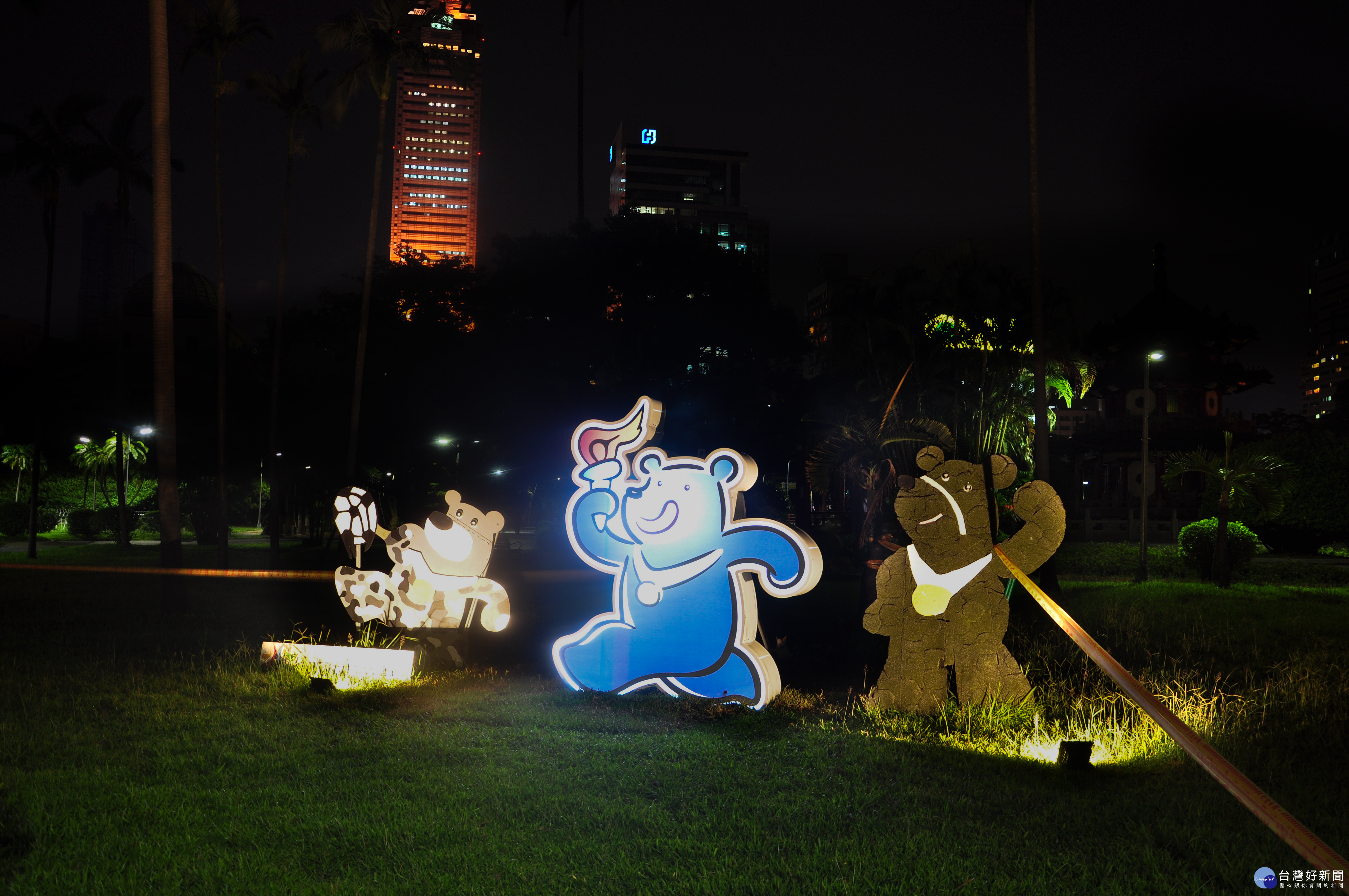 工務局公園處處長黃立遠表示,配合世大運美化市容,該處在228和平紀念公園、圓山花博公園及士林官邸分別布置「聖火」、「歡呼」、「加油!加油!」及「我最行」4種生動造型熊讚,華燈初上時,醒目亮眼的LED熊讚增添樂趣與熱鬧氛圍,是情侶、朋友下班後約會散步的好地方。另外,公園處發揮綠手指巧思在市區聯外道路、安全島、圓環、公園綠地布置許多立體綠雕,營造活潑盎然的歡迎氣氛;為了延伸創造光影效果,在仁愛圓環、北投公園、臺北車站站前廣場等處則加裝燈光妝點,呈現單純寧靜的視覺。