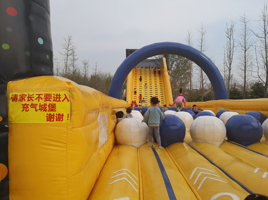 4月7日,記者在北京市昌平區農業嘉年華園區看到,廣場上的充氣城堡樂園正在營業,該樂園有大小兩座充氣滑梯,其中最大的充氣滑梯高約10米,它的一面如同攀岩的岩壁,孩子們一個接一個踩着“岩點”向高處攀登,到七八米的高處后從另一面的滑梯滑下。