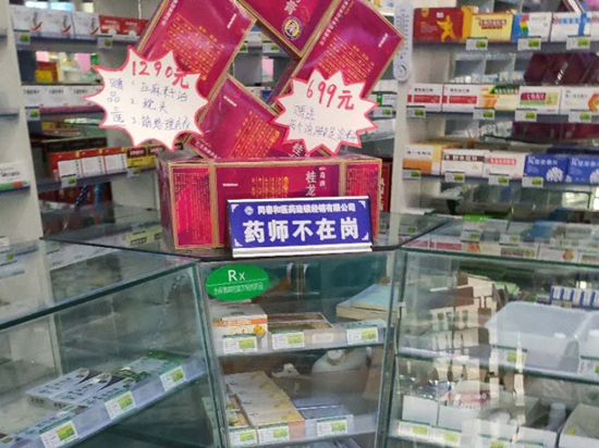 在鎮賚縣街頭,記者走訪獲知,同春和醫藥連鎖在該縣城內有多家連鎖店,是當地一家規模比較大的連鎖醫藥機構。記者先後暗訪了同春和醫藥連鎖的萬福來店、鐵北店、中街店,發現這些藥店內均無執業藥師在崗,有的櫃檯上也擺了一塊“藥師不在崗”的牌子。同樣,記者在這3家藥店均很輕鬆地購買到了處方葯。更令記者吃驚的是,在暗訪過程中,藥店工作人員對違規銷售處方葯的行為習以為常。