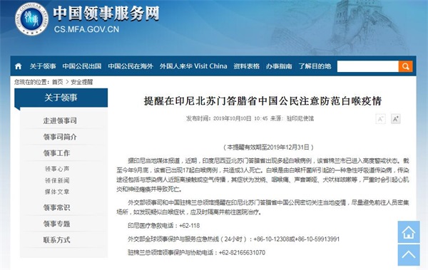 外交部領事司和中國駐棉蘭總領館提醒在印尼北蘇門答臘省中國公民密切關注當地疫情,盡量避免前往人員密集場所,如發現疑似白喉癥狀,應及時隔離並前往醫院治療。