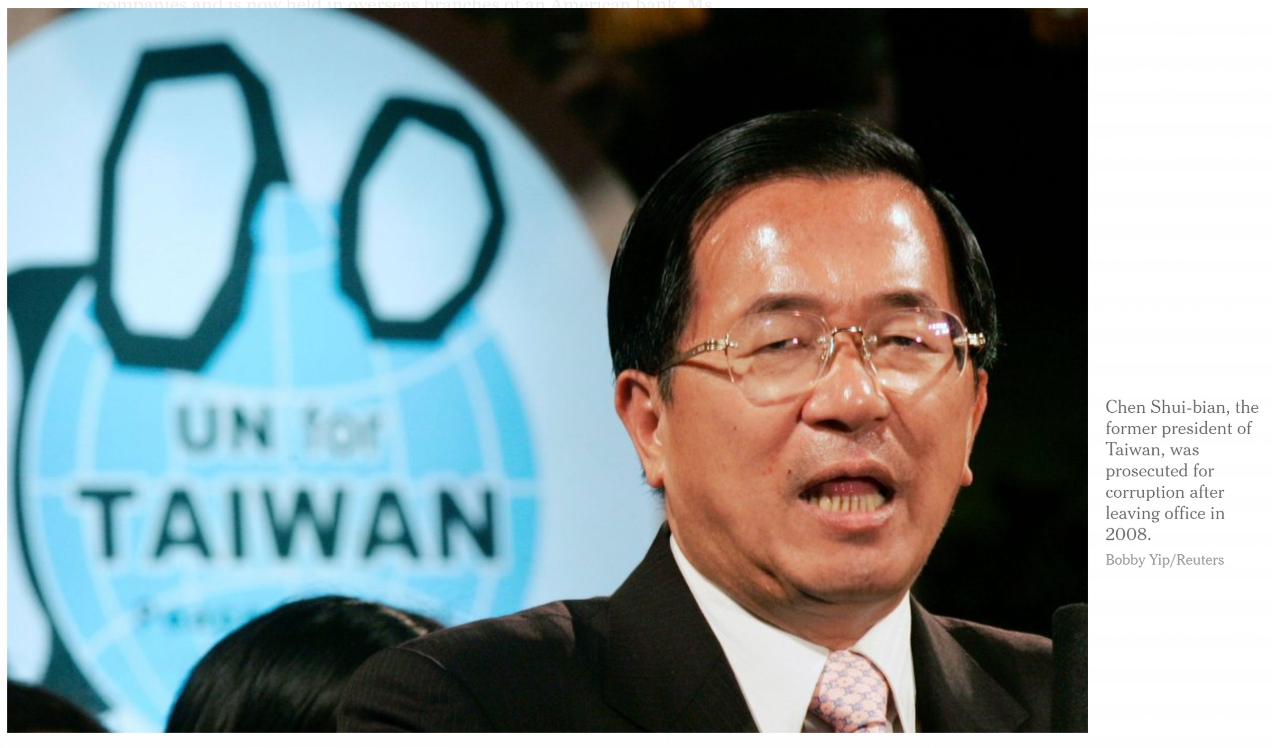 那第 2 名貪腐的世界領袖到底是誰? 各位看倌可得深呼吸一口唷… 說來令臺灣人臉紅, 紐約時報第 2 名的世界貪腐領袖是陳水扁。   紐約時報報導,陳水扁─台灣的前總統在2008年卸任後被起訴, 他使用贓款, 買下了曼哈頓的高級公寓和在弗吉尼亞州的葡萄酒之鄉, 風景秀麗的山丘豪宅。陳氏夫婦, 把受賄的錢透過空殼公司在英屬維爾京群島和尼維斯, 再透過瑞士銀行帳戶細洗錢,進入由陳氏夫婦兒子控制, 用來掩蓋家庭在美國購買的物業。 當然這兩個物業已經被美國政府充公沒收。   這一篇有關陳水扁的夫婦的報導,使臺灣又回到國際媒體舞臺。 紐約時報是一個屬於世界級的報紙, 不是一般人可以輕易上紐時新聞,陳前總統不但被列入世界貪腐領袖的第 2 名,而且,紐約時報登載了陳水扁先生的彩色玉照, 不知是給足了臺灣的面子,還是丟足了台灣人的臉,躍登全球第二名,也真厲害。陳水扁,世界不會忘記你的惡劣!