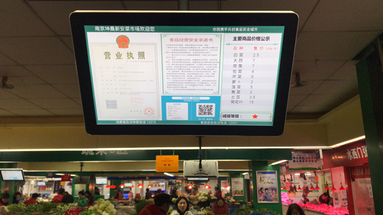 建鄴區所有農貿市場每天早上對經營戶銷售的蔬菜、水果、肉類和水產隨機抽樣檢驗,並將檢驗結果在市場內的电子大屏上滾動公示。農貿市場管理方能自動上傳食品快檢情況,經營者能通過手機App掃描錄入購物票證,監管部門可以通過手機App隨時隨地掌握農貿市場食品安全情況,消費者可以通過掃描二維碼獲得詳細的商品信息。“現在只要用手機一點,就可以實時了解所購食品的情況。”一位消費者對此贊不絕口。