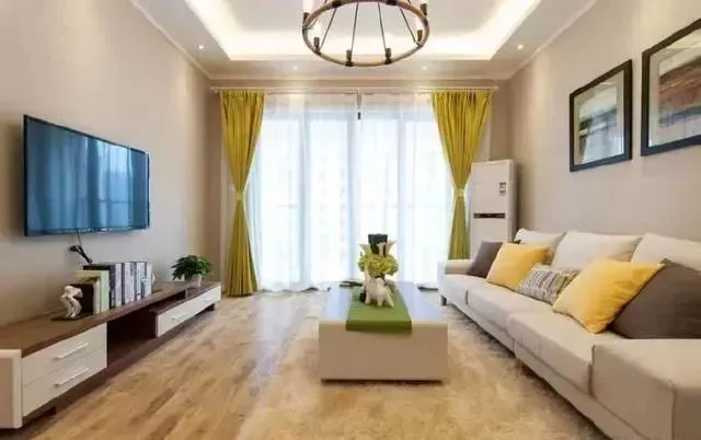 長方形的簡單吊頂,燈具也很獨特,沒有水晶燈的繁複,也不至於像吸頂燈那樣單調。淺色的棉麻布料的布藝組合沙發,和整個牆面的米黃色,絕配!