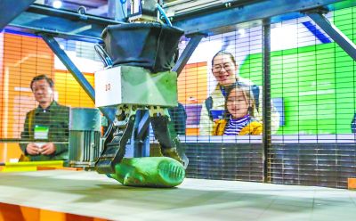 在科博會北京展區,參觀者觀看智能垃圾分類機器人。本報記者 武亦彬攝