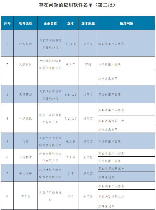 人民網北京1月9日電(許維娜)8日,工信部發布了《關於侵害用戶權益行為的APP(第二批)通報》,《通報》將第二批發現存在問題且未完成整改的15款APP向社會通報,並指出APP應在2020年1月17日前完成整改落實工作,逾期不整改的,工信部將依法依規組織開展相關處置工作。