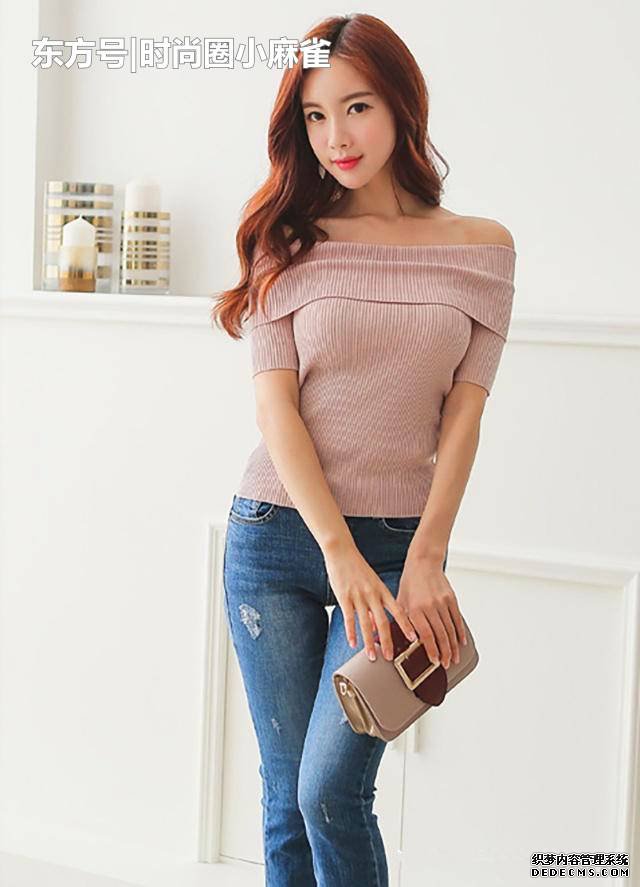 今天這款喇叭牛仔褲,穿上它之後,金惠美顯得更加知性,就像是一位已婚女士的優雅生活一樣,給人特別舒服的感受,一件T恤針織衫,一字肩的設計,配上一款淺卡色的包包,加上一雙高跟涼鞋,讓這件牛仔褲的比例更加完美,秀腿提臀,這是牛仔褲材質的經典屬性之一,讓女人的身材更加完美哦。