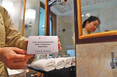 11日,北京人衛酒店,保潔員將環保提示牌放置在衛生間。