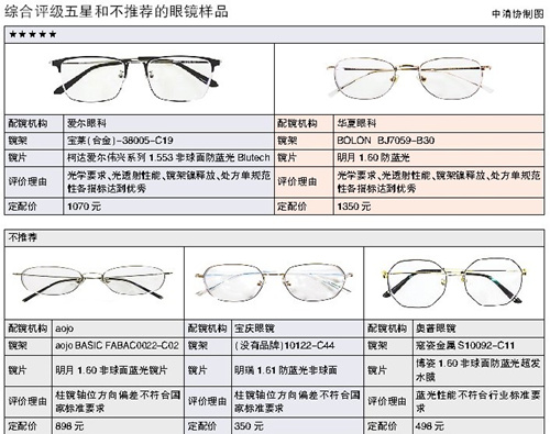 經過比較試驗,中消協結合光學要求、透射性能、鏡架鎳釋放、處方單規範,對20款樣品眼鏡進行綜合評級。其中,五星評分的眼鏡有兩款,分別是1070元的愛爾眼科和1350元的華夏眼鏡,這兩款眼鏡光學要求、光透射性能、鏡架鎳釋放、處方單規範性各指標達到優秀。而不推薦購買的有3款,分別是aojo、寶慶眼鏡、奧普眼鏡,3款眼鏡均有一項指標不符合國家標準,它們價格在350元-898元之間。