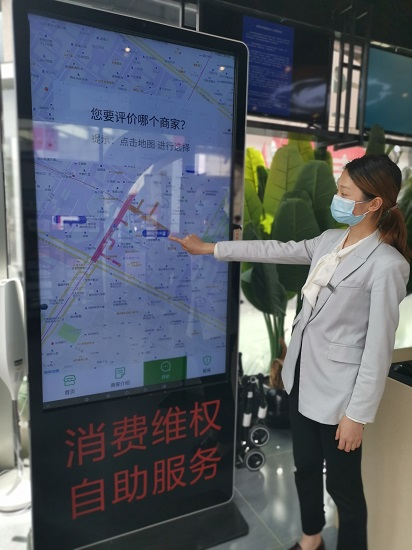 在成都市春熙路的消費維權自助服務終端機上,消費者可以自助選擇商家進行消費評價。