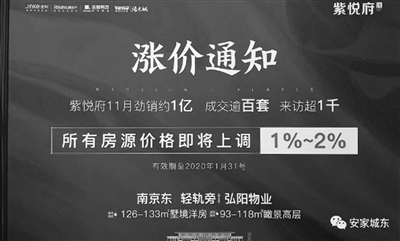 由於距離南京比較近,且交通、生活配套等相對完善,南京以東的句容、寶華等地樓盤成為不少剛需一族購房置業的重點關注“對象”。然而,原本以價格優勢取勝的當地多家樓盤,近日卻紛紛喊出了“漲價”的聲音,比如句容恆大文化旅遊城的置業顧問在朋友圈發布的信息显示,“購房優惠政策即將全面收回”,並表示目前是“抄底買入的最後窗口期,觀望即是錯過,2020年1月1日起價格將全面上調”。揚子晚報記者了解到,該樓盤在售戶型為80平方米-160平方米不等,均價11000元/�O左右,至於明年元旦後房價會漲至多少,並沒有查詢到相關信息。