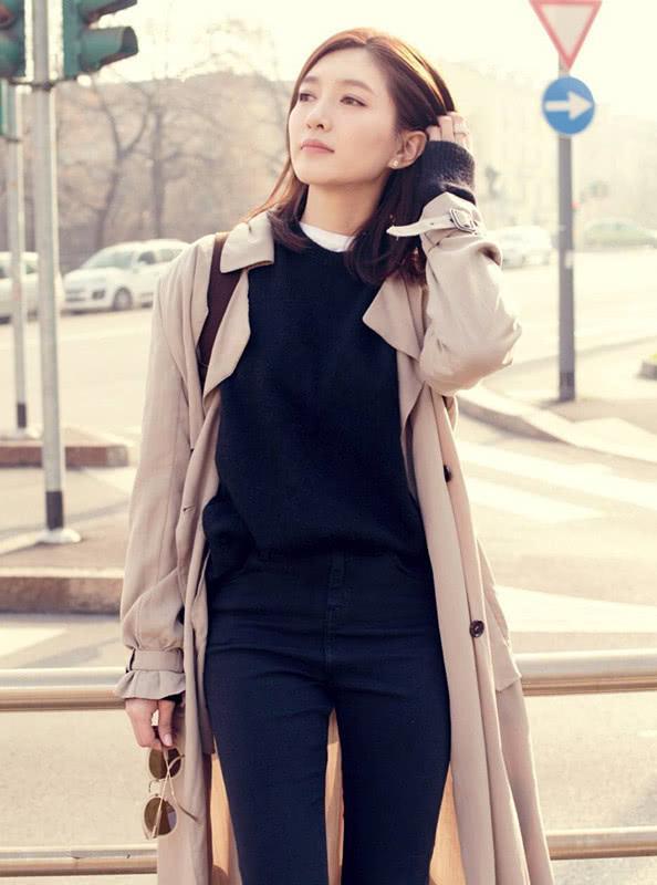 江疏影文藝女神的氣質名副其實,裸色的風衣是少不了的,內搭黑色的針織衫什麼的就行了,加上要是自己有一頭烏黑的長發,這個造型是不是就和小說里的文藝女神差不多?