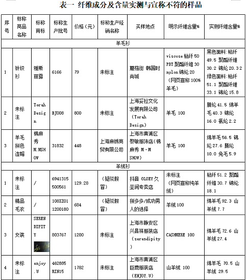 本次比較試驗發現,有7件樣品的纖維成分及含量與其宣稱不一致,其中,從蘑菇街和抖音上購買的2件樣品,其網頁宣稱為“100%羊毛”或“純羊絨”,但經檢測其實際並不含有羊毛或羊絨成分,7件從時尚小店購買的樣品中有4件實測纖維成分及含量與其宣稱不符。此外,本次比較試驗價格最低的2件樣品均不含羊毛或羊絨成分。