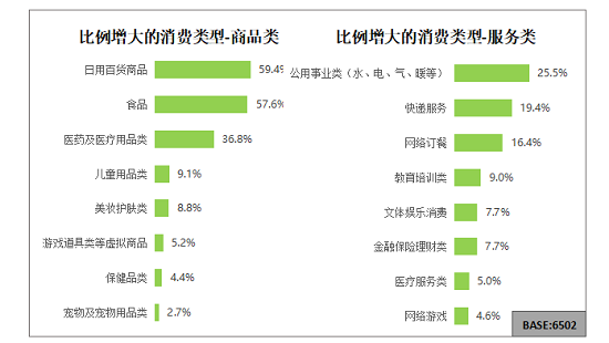 新冠肺炎疫情加速了日常生活類消費線上化。調查結果显示,與以往相比,受訪者對日常生活商品和服務的線上消費類型變動較大。商品類消費中,59.4%的受訪者表示日用百貨類商品的線上消費佔比增大,57.6%的受訪者表示食品類商品的線上消費比例增大,36.8%的受訪者表示醫藥及醫療用品類商品的線上消費比例增大。服務類消費中,線上消費比例增大排在前三的消費類型分別為公用事業類(水、電、氣、暖等)、快遞業務和網絡訂餐,佔比分別為25.5%、19.4%和16.4%。可以發現,疫情期間日常生活類消費線上佔比增加較多,這將促進日常生活類消費加速向線上消費方式轉移。疫情期間醫療服務類線上消費增長明顯,36.8%的受訪者在醫藥及醫療用品類和5.0%的受訪者在醫療服務類的線上消費比例明顯增加。