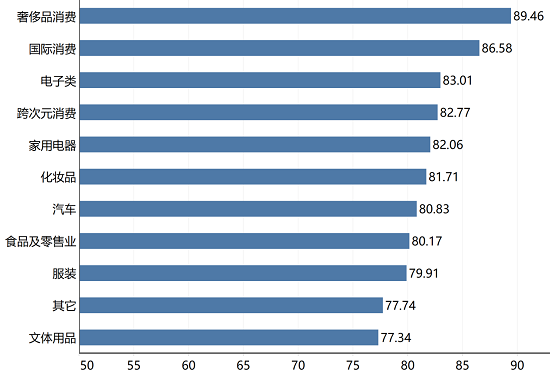 對各消費領域分析后發現,奢侈品消費得分最高,達到89.46分,而文體類用品的滿意度得分相對較低為77.34分,但是總體來說,消費者對各消費領域的滿意度都較高。