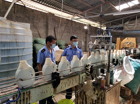 執法人員正在查看尚在工作中的洗衣液生產線。黃傳真攝