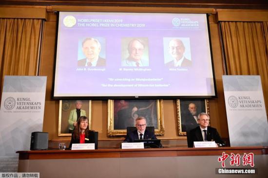 資料圖:當地時間2019年10月9日,瑞典皇家科學院將2019年諾貝爾化學獎授予約翰·古迪納夫(John B. Goodenough)、M·斯坦利·威廷漢(M. Stanley Whittingham)和吉野彰(Akira Yoshino),以表彰其在鋰電池發展上所做的貢獻。