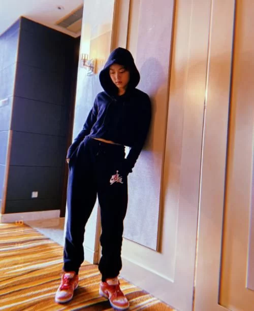 趙今麥臉型頗為圓潤,眼睛又大又圓看着很有靈氣,她身上穿着套黑色休閑服,上半身是連帽款衛衣,將帽子戴在頭頂上,顯得臉型更小巧;一條系帶垂放在身前,鬆鬆垮垮系著看着更隨性;下方則是一條運動長褲,版型寬鬆頗為舒適;搭配紅粉色運動鞋,看着簡單卻又充滿活力。