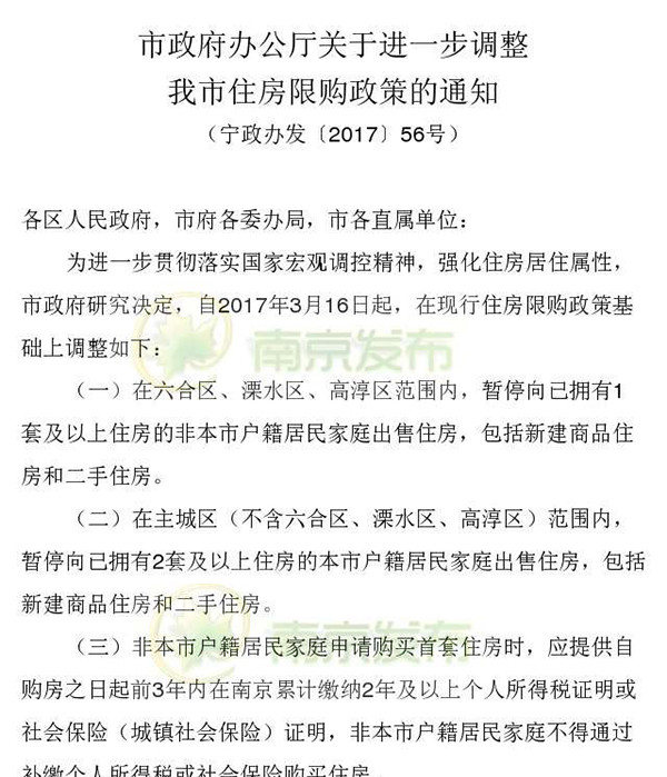 3月15日,江蘇省南京市政府辦公廳發布《關於進一步調整南京市住房限購政策的通知》。《通知》規定,從3月16日起,南京將高淳、溧水、六合納入限購範圍,暫停向已擁有1套及以上住房的非南京市戶籍的家庭出售新房或二手房;南京主城區(不包括高淳區、溧水區、六合區)已擁有2套及以上南京戶籍家庭不得購買新房或二手房。