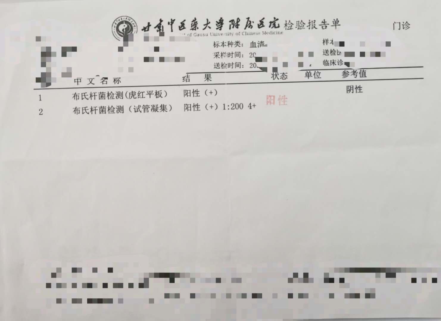 顧雅在今年1月3日做的檢驗報告單显示,其布氏桿菌檢測(虎紅平板)陽性(+);布氏桿菌檢測(試管凝集)陽性(+)1:200 (4+);檢測結果為“陽性”。今年7月,她再檢測結果显示SAT(試管凝集)為1:200+++,RBPT(虎紅平板)仍為陽性。