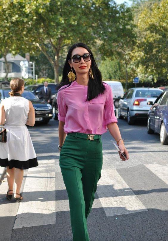 粉色也可以撞深綠色,但是這樣的搭配很容易顯得俗氣,有一個很好的解決辦法就是搭配“金色系”的輔助單品作為點綴,因為粉色和深綠色都很“聽”金色的話,在它的“約束”之下,兩個反差大的顏色會變得“服服帖帖”。