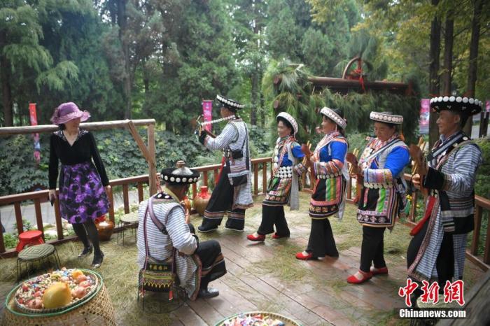 10月2日,一名遊客跟着傈僳族民眾跳舞。“十一”黃金周期間,昆明市雲南民族村推出豐富多彩的節日活動,吸引眾多遊客到此體驗雲南少數民族風情。中新社記者 劉冉陽 攝