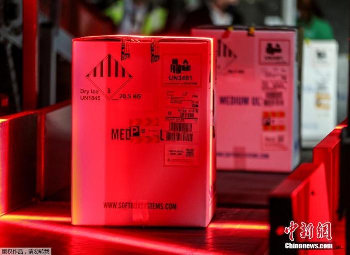 圖為裝有輝瑞疫苗的箱子從航空運輸集裝箱中卸下。