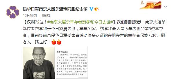 中新網12月18日電 據侵華日軍南京大屠殺遇難同胞紀念館官方微博消息,南京大屠殺倖存者賀孝和於今日凌晨去世,享年91歲。賀孝和老人是今年去世的第5位倖存者,目前經南京侵華日軍受害者援助協會認證的在冊在世的倖存者僅剩72位。