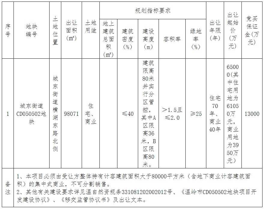 資料显示,該地塊編號為溫土公告字[2020]整第85號,位於吳興區城東街道橫湖東路北側,基地西臨薛家港,東側為烏山路,北側為恭弘=恭弘=叶 恭弘 恭弘堤漾路,南側為囡兒港。出讓面積36474.69㎡,起始價3.17億元,競買保證金1.3億元,建築密度≤40%,率≥25%,建築限高80米並實行分區管控,其中A區限高36米,B區限高80米。