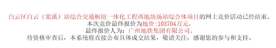 地塊編號穗規劃資源掛出告字〔2020〕115號,地塊位於白雲區白雲(棠溪)站綜合交通樞紐一體化工程西地塊場站綜合體項目,土地用途為廣場用地兼容交通樞紐用地、商業用地、商務用地,宗地面積43191(可建設用地面積43191),計容面積≤122414(蓋上建築面積),起始價10.37億元。