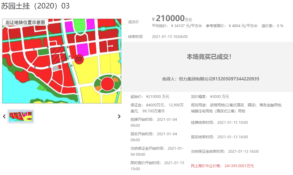 中國網地產訊 1月15日,蘇州2宗地塊集中出讓,總出讓面積9.66萬平,總起始價21.63億元。最終恆力集團以21億元競得蘇園土掛(2020)03號,樓麵價4803.81元/平。