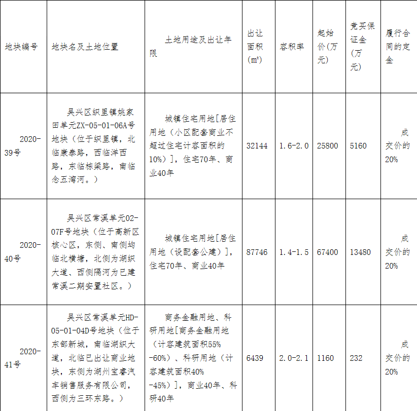 地塊編號2020-39號,地塊名稱吳興區織里鎮姚家田單元ZX-05-01-06A號地塊,出讓面積3.21萬平,土地用途為商住用地,容積率2,建築面積6.43萬平,起始價2.58億元。